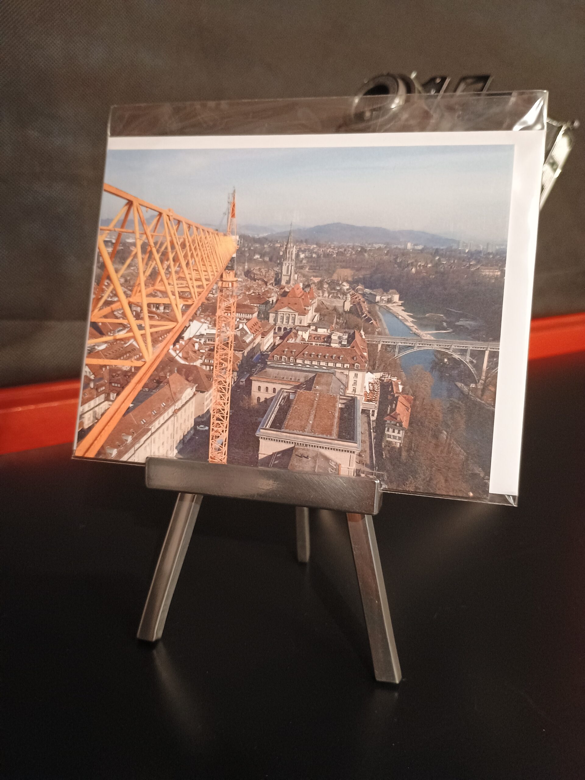 Gefaltete Schreibkarte mit Sujet: Aussicht in der Bundesstadt Bern von einem Liebherr Baukran über die Bundeshaus Gebäude gen das Müster mit der Münsterplattform.