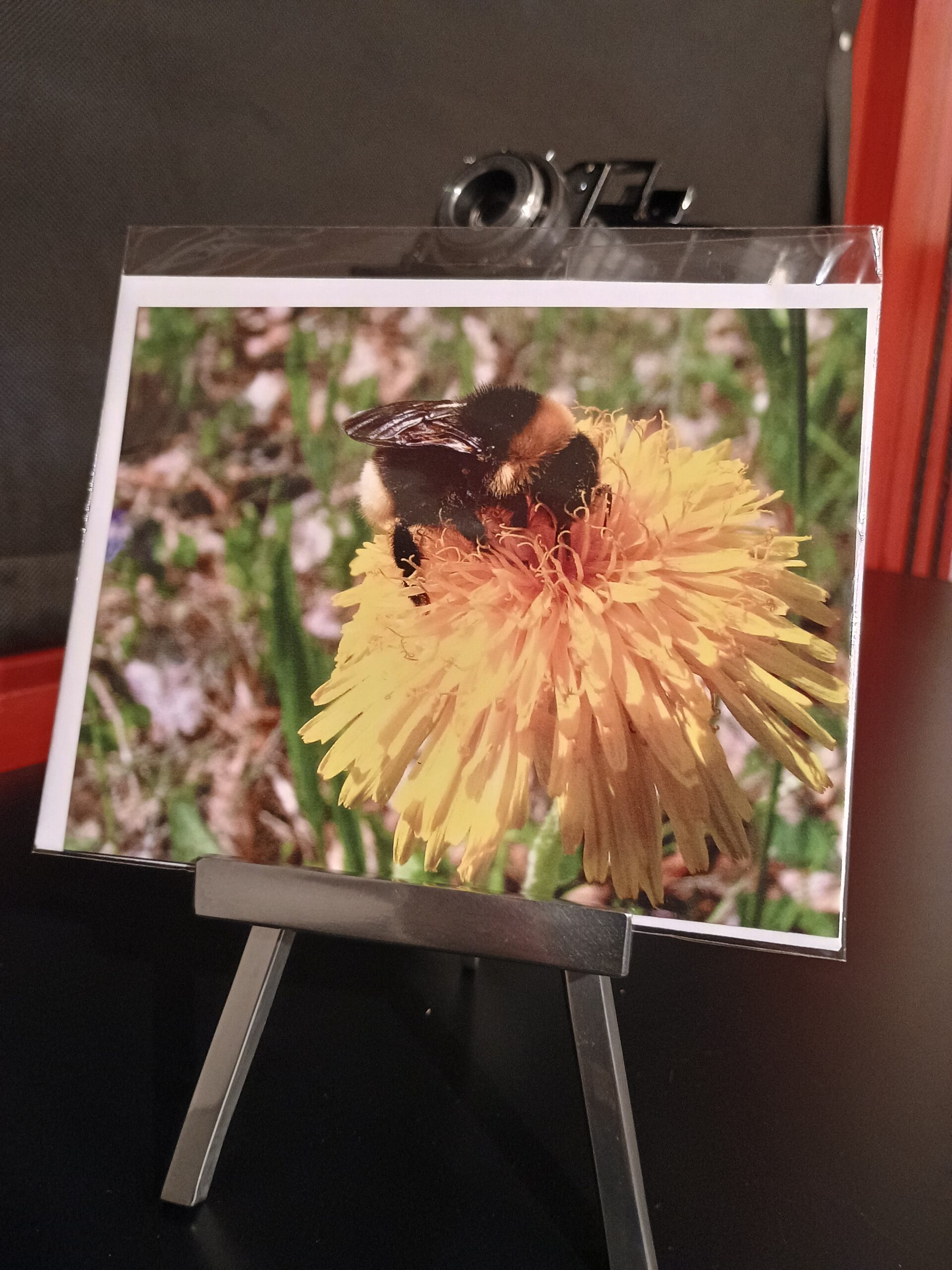 Gefaltete Schreibkarte mit Sujet: Biene am Honigsammeln auf Sommerlichem Löwenzahn.