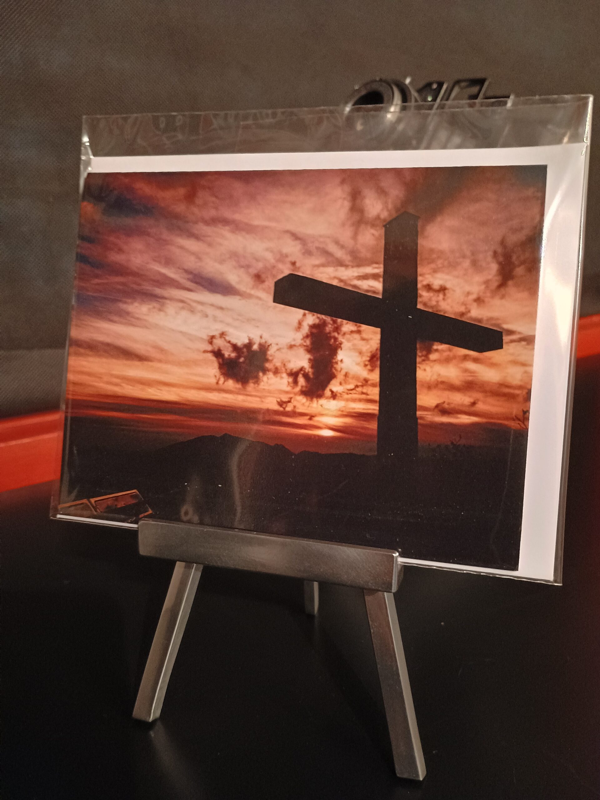 Gefaltete Schreibkarte mit Sujet: Kreuz Jesu Christi im Sonnenuntergang als Symbol der Wiederaufeerstehung auf einer Schreibkarte für Kondolenzschreiben bei Todesfall.